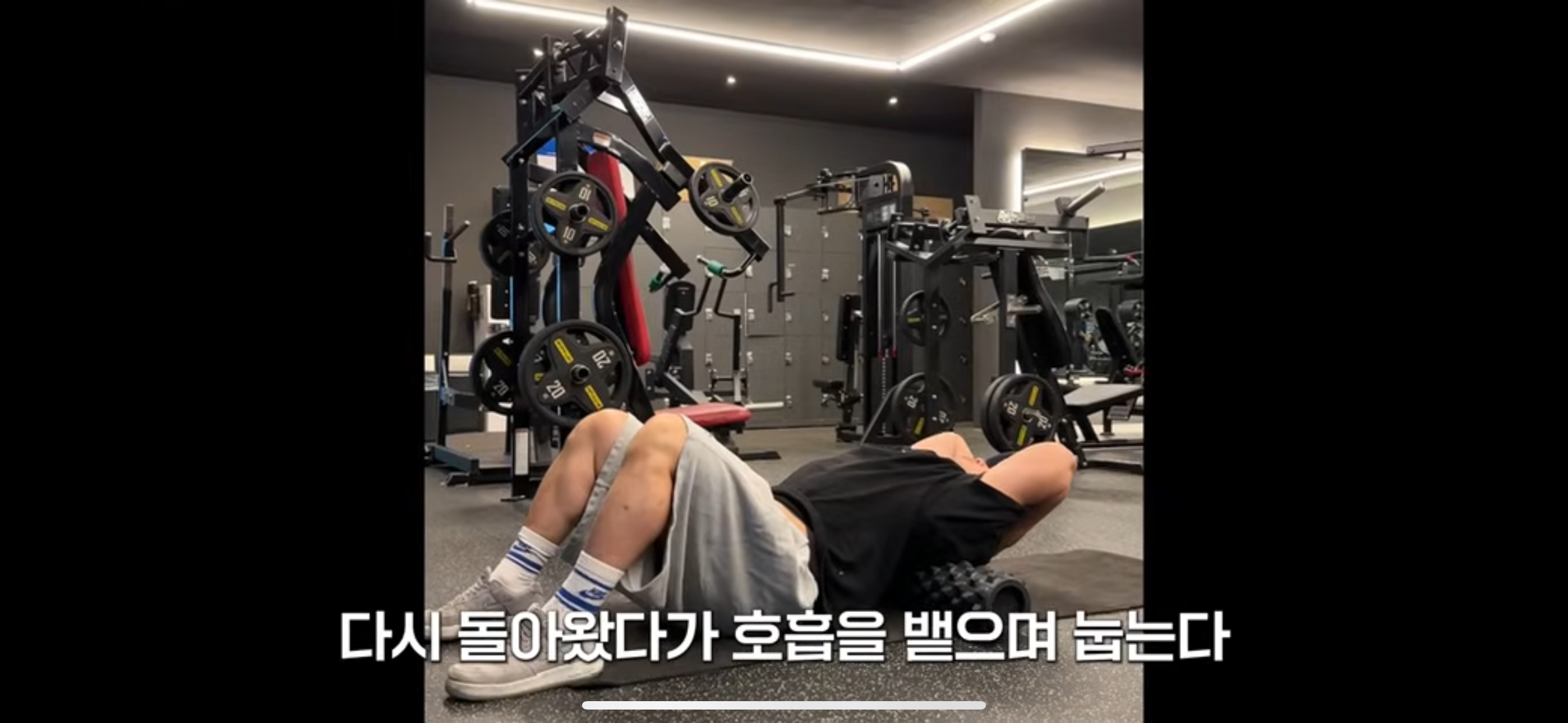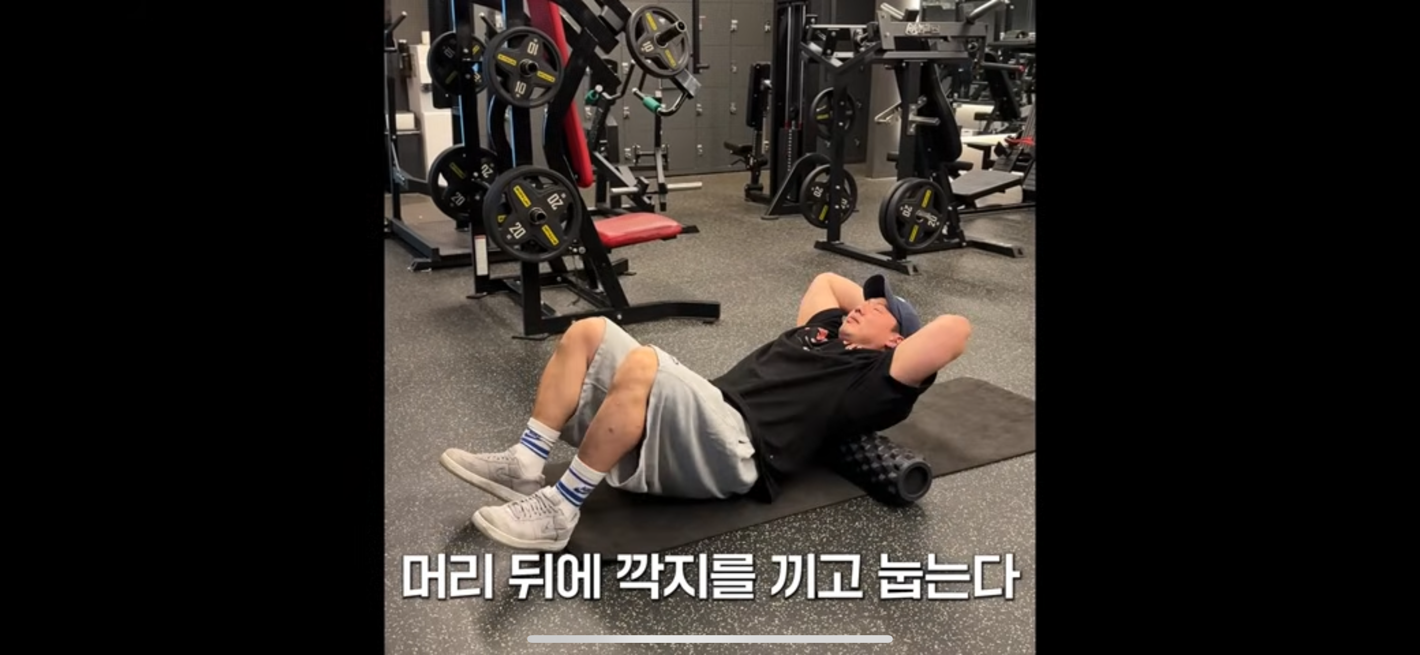 저도 등운동 전 항상 폼롤러를 통해 등근육을 풀어주는데요, 오늘도 준비운동 겸 전신스트레칭을 한 뒤 폼롤러를 통해 대둔근부터 상부승모근까지 근막을 풀어주었습니다. 그 뒤 뭉트니스 채널에서 제시한 대로 발바닥을 바닥에 고정시키고 머리에 깍지를 낀채로 폼롤러에 등을 대고 누워었습니다. 그상태로 목은 깍지를 낀 팔로 받쳐준채로 머리가 바닥에 닿을때까지 서서히 힘을빼며 등을 이완, 원자세로 복귀하는 것을 약 15회 정도 반복하였습니다.