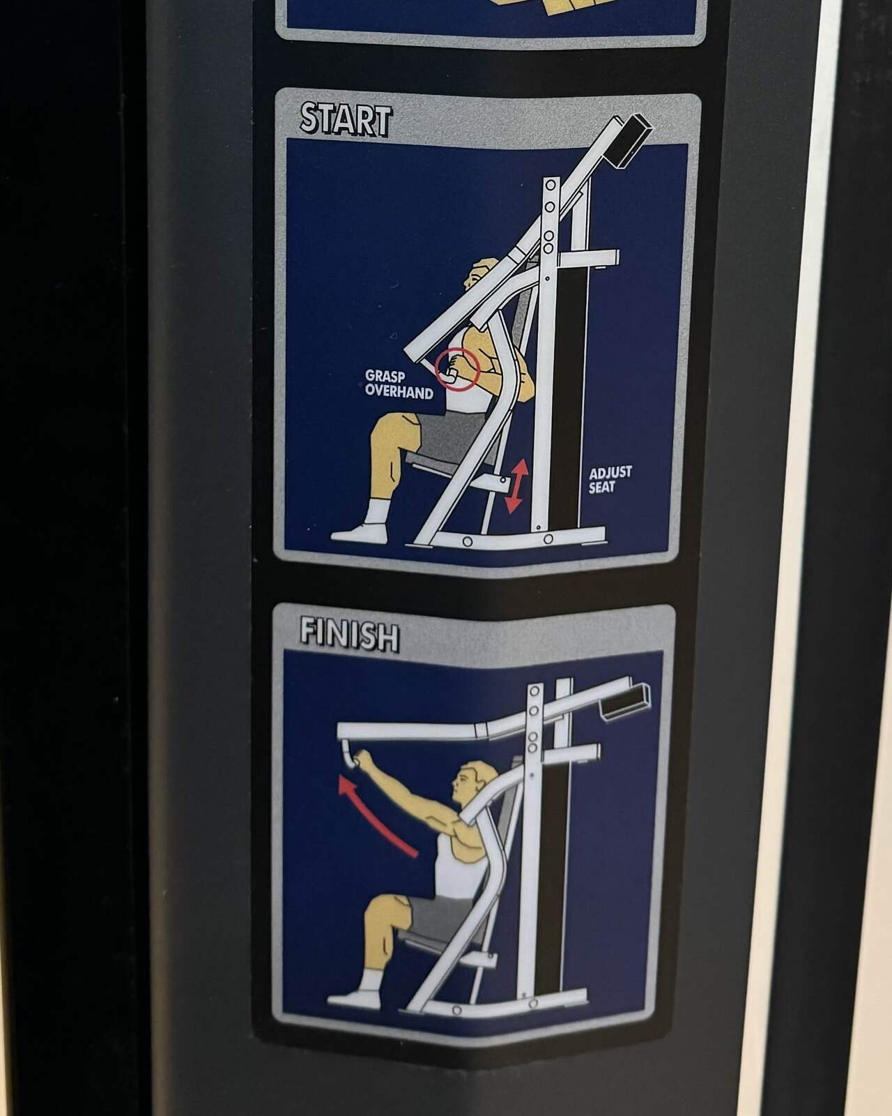 2. 의자의 높낮이를 조절합니다. 위 머신의 중량을 최저로 설정한 뒤 그립을 밀엇다가 놓앗다 해보시면서 궤적을 확인해보세요, 머신의 그립에 자신의 쇄골라인을 맞추는 것을 추천합니다.