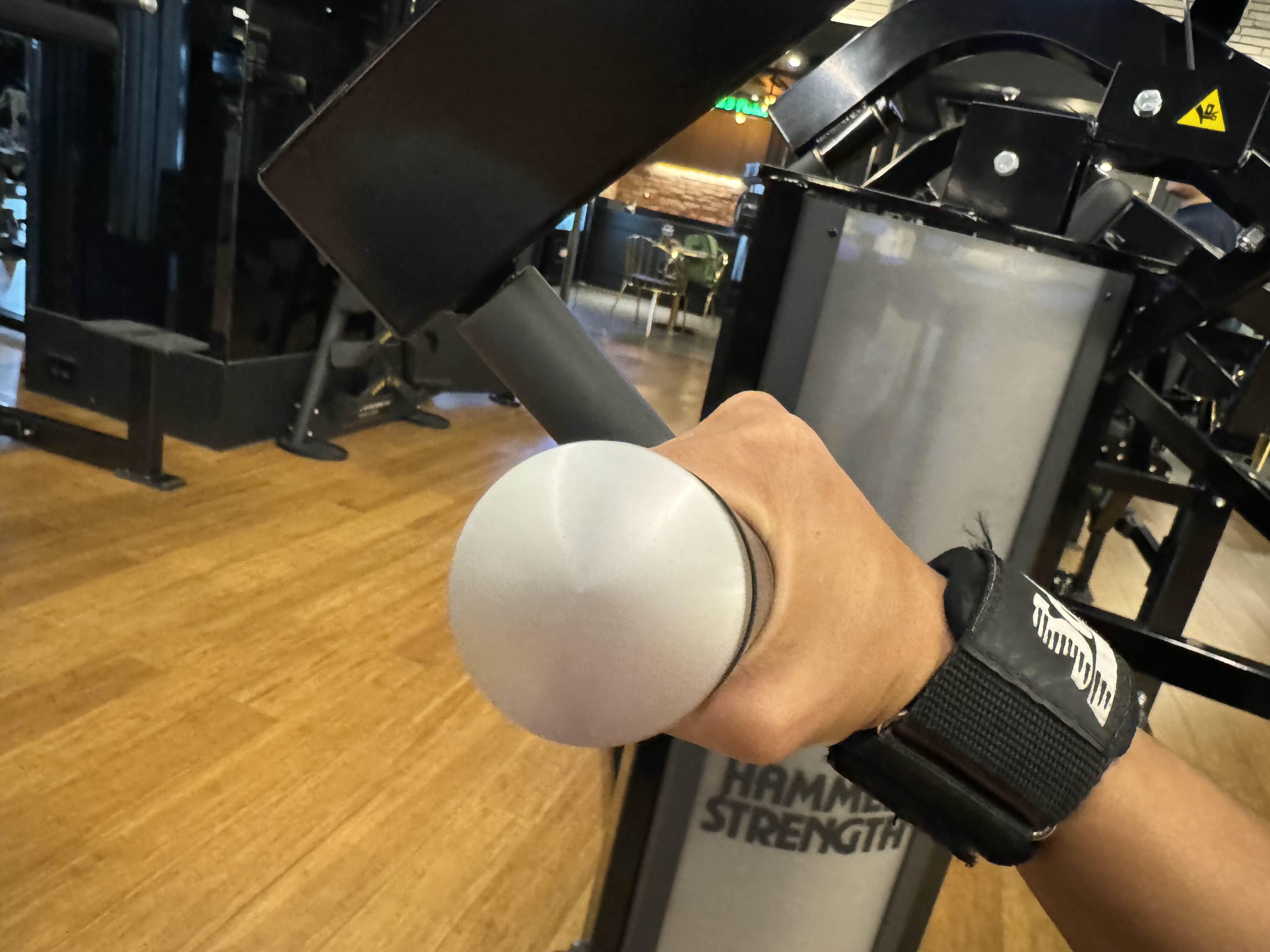 4. 그립을 파지합니다. 이때 주의할 점은 우리가 머신의 궤적을 확인하였듯이 해머스트렝스 MTS 인클라인 프레스는 직선으로 움직이는게 아니라 곡선을 그리며 상향합니다. 그러면 우리도 가슴(쇄골라인)-상완-전완을 그립의 궤적에 맞춰야 해당 머신의 의도인 윗가슴을 운동하기에 좋습니다. 그립의 넓이는 너무 좁게 잡으면 삼두로 자극이 빠져버리므로 상완과 전완이 직각이 되는 정도가 좋습니다. 그립은 궤적이 출발하는 지점에 맞추어 척골로 파지를 하여 손목 통증에 대비합시다.