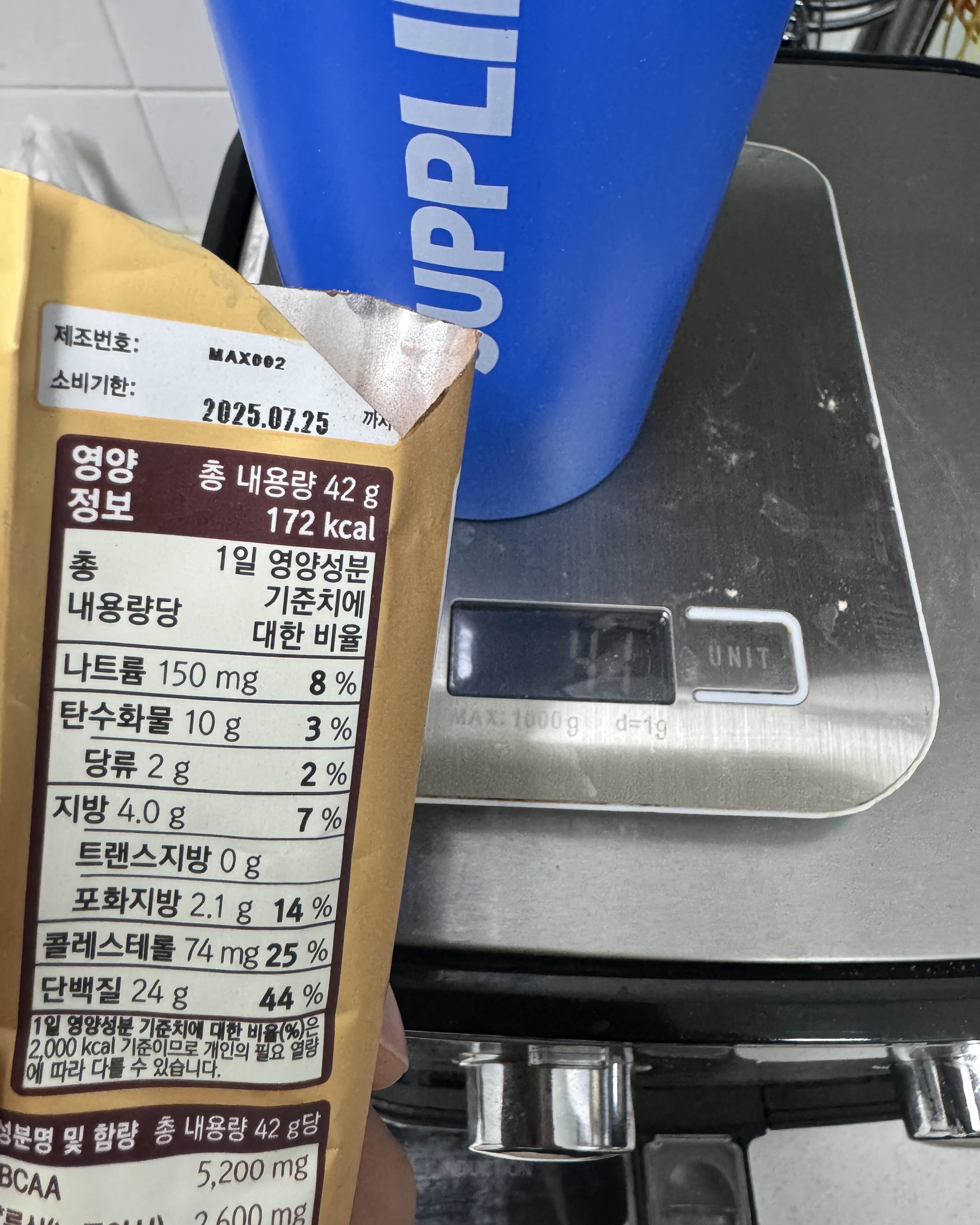 닥터유 프로 맥스 1봉지 (42g)와 정수물 200ml를 섞어서 마셨습니다.