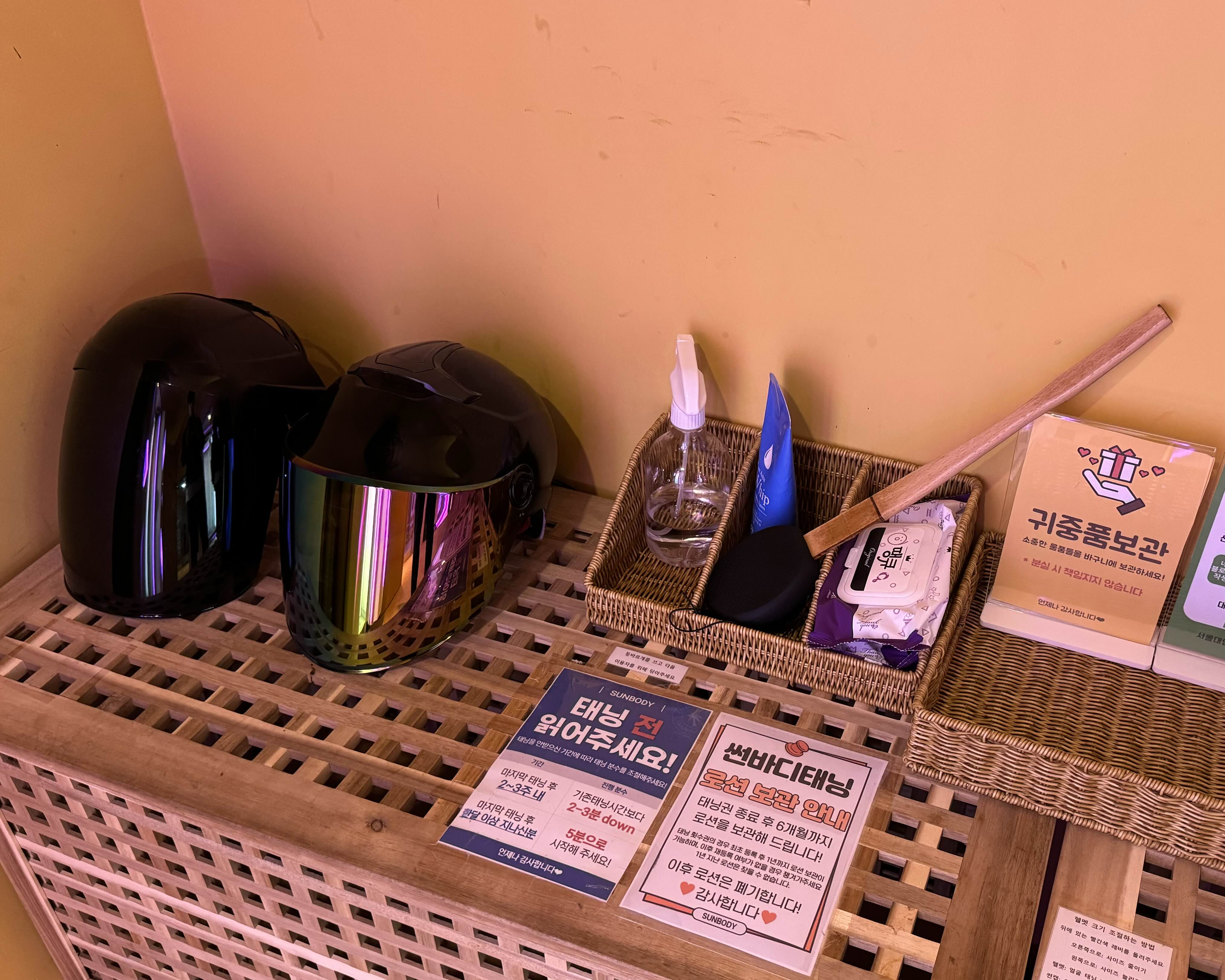 준비물은 모두 태닝샵에 비치되어 있고!! (썬바디 태닝 샵 내부에 로션, 썬 캡 등 모두 비치되어 있어요)