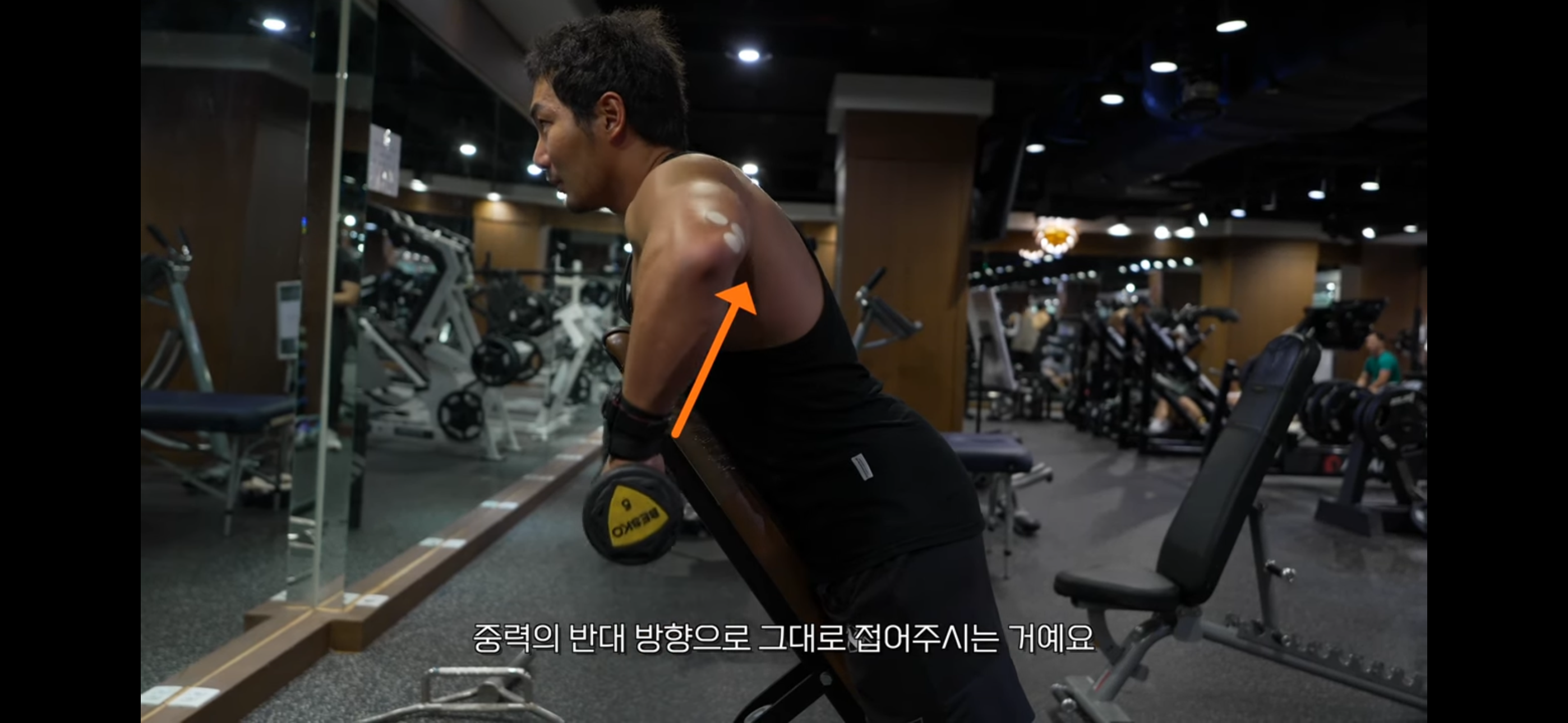 시선은 정면을 (거울) 바라보고 후면 삼각근이 올라오는 것을 봐야된다고 하네요, 주의할 점은 최대한 어깨가 들썩이지 않고 팔꿈치만 수직으로 당기라고 제안하시네요. 그 이유는 밑에서 중력의 반대 방향으로 무거운 물체(덤벨)을 들려고 하면 우리 인체에서 가장 힘이 센 승모근을 쓰려는 경향이 있기 때문에 승모근을 쓰지 않고 어깨는 밑으로 눌러 놓은 채로 팔꿈치만 접는다는 생각으로 수행하는 것을 추천하네요.